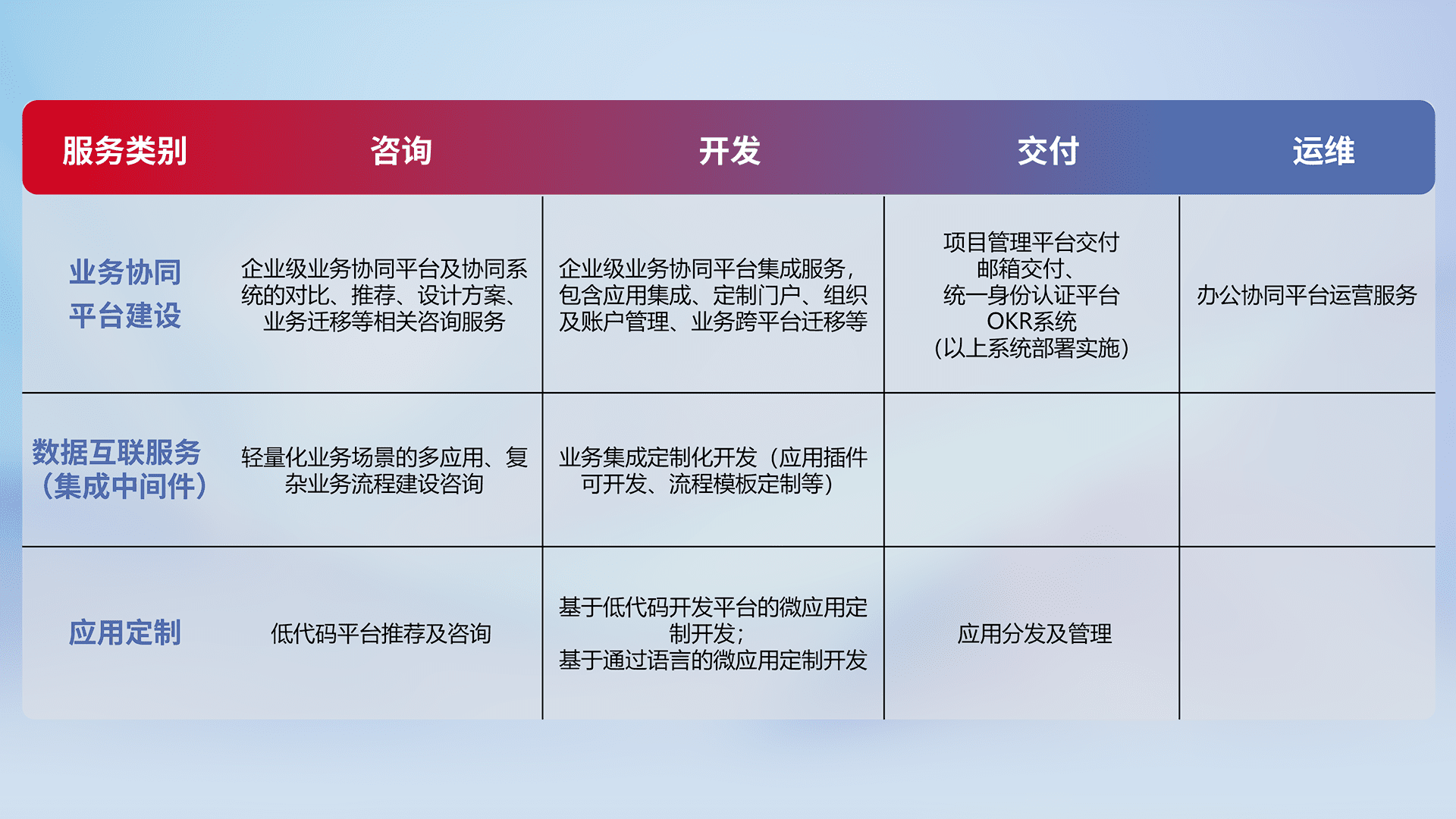 针对钉钉、、、企微、、IDaas等平台级产品提供产品的规划、、、方案、、交付、、定制化开发等服务,,实现如统一协同办公、、、、智能客户服务、、、、混合会议管理、、、、智能数据查询、、、、等业务场景,,实现数字化转型。。。